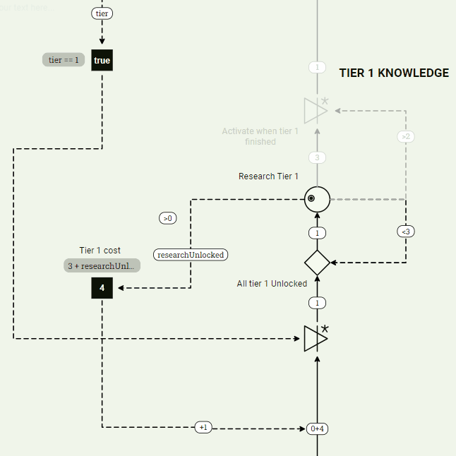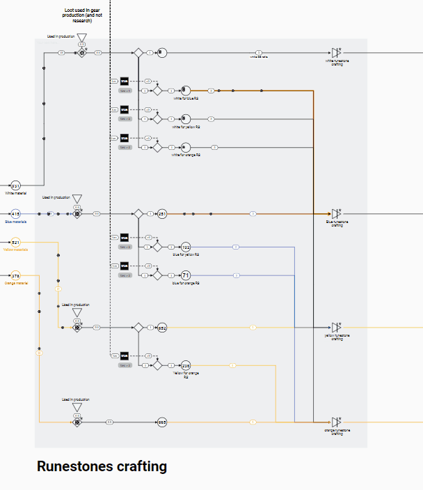 To simulate the economy of the research feature, I realized a machination. I organized it into three parts : The looting, the crafting of runestones and the research of new technologies.